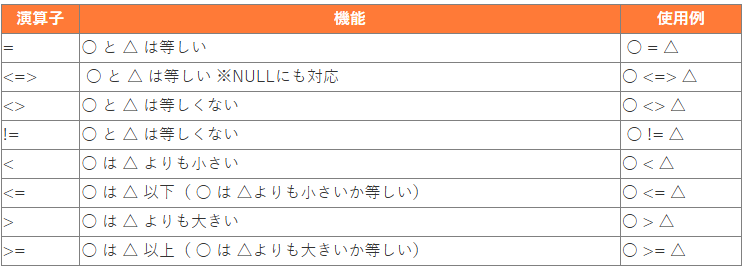 ③カラムの条件を指定して抽出する場合に使用。比較演算子など使える